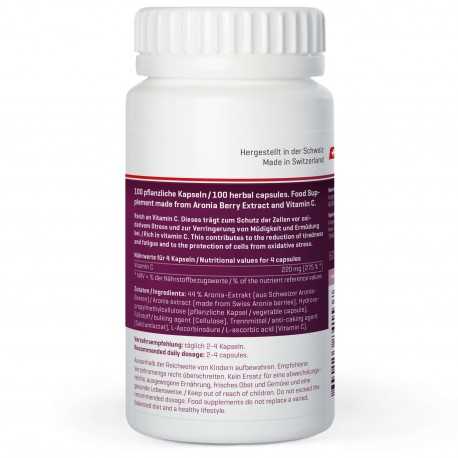 Aronia Vida enthält 100 Kapseln mit je 500 mg Aroniabeeren-Extrakt und Vitamin C. Inhalt netto 60g. Wir verwenden ausschliesslich Vegi-Kapselhüllen, hergestellt aus pflanzlichem Material (HPMC) ohne Gelatine. Aronia Vida ist lieferbar ab Lager.