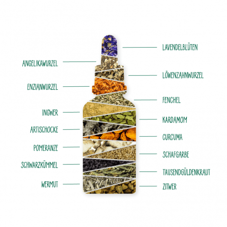 Alkohol, Wasser, Tausendgüldenkraut, Wermutkraut, Artischockenkraut, Enzianwurzel, Pomeranzenfrüchte unreif, Ingwerwurzel geschält, Kardamom mit Schale, Curcuma, Löwenzahnwurzel, Schafgarbenkraut mit Blüten, Angelikawurzel, Zitwerwurzel, Fenchel braun bitter, Schwarzkümmelsamen, Lavendelblüten.