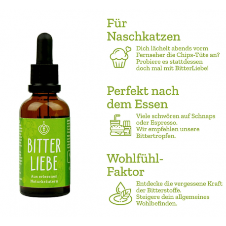 Unsere BitterLiebe-Tropfen enthalten nur die wertvollsten Bitterstoffe aus 15 erlesenen Naturkräutern. Alle BitterLiebe Produkte sind garantiert tierversuchsfrei und für Veganer geeignet.