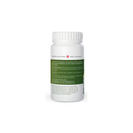 Artemisia Mini enthält 144 Kapseln mit je 300 mg getrockneten, gemahlenen Blattspitzen der Artemisia-Pflanze aus biologischem Anbau sowie Vitamin B6, Folsäure (auch Vitamin B9) und Vitamin B12. Inhalt netto 51 g.